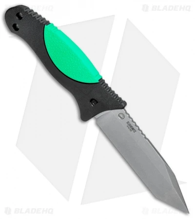 This EX-F02 model has a stonewashed tanto blade and black handle with a green rubber overmold.