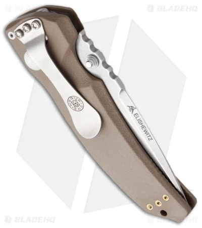 Features one-piece matte brown frame which is made from high glass content reinforced polymer. 154-CM stonewashed blade. Push button lock mechanism. The blade comes out with a refined smoothness and locks securely into place. For easy carry there is also reversible pocket clip.
