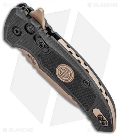 This model of the Hogue X1 Microflip sports a bronze FDE Wharncliffe blade with a textured black G-10 handle set with a Sig medallion.